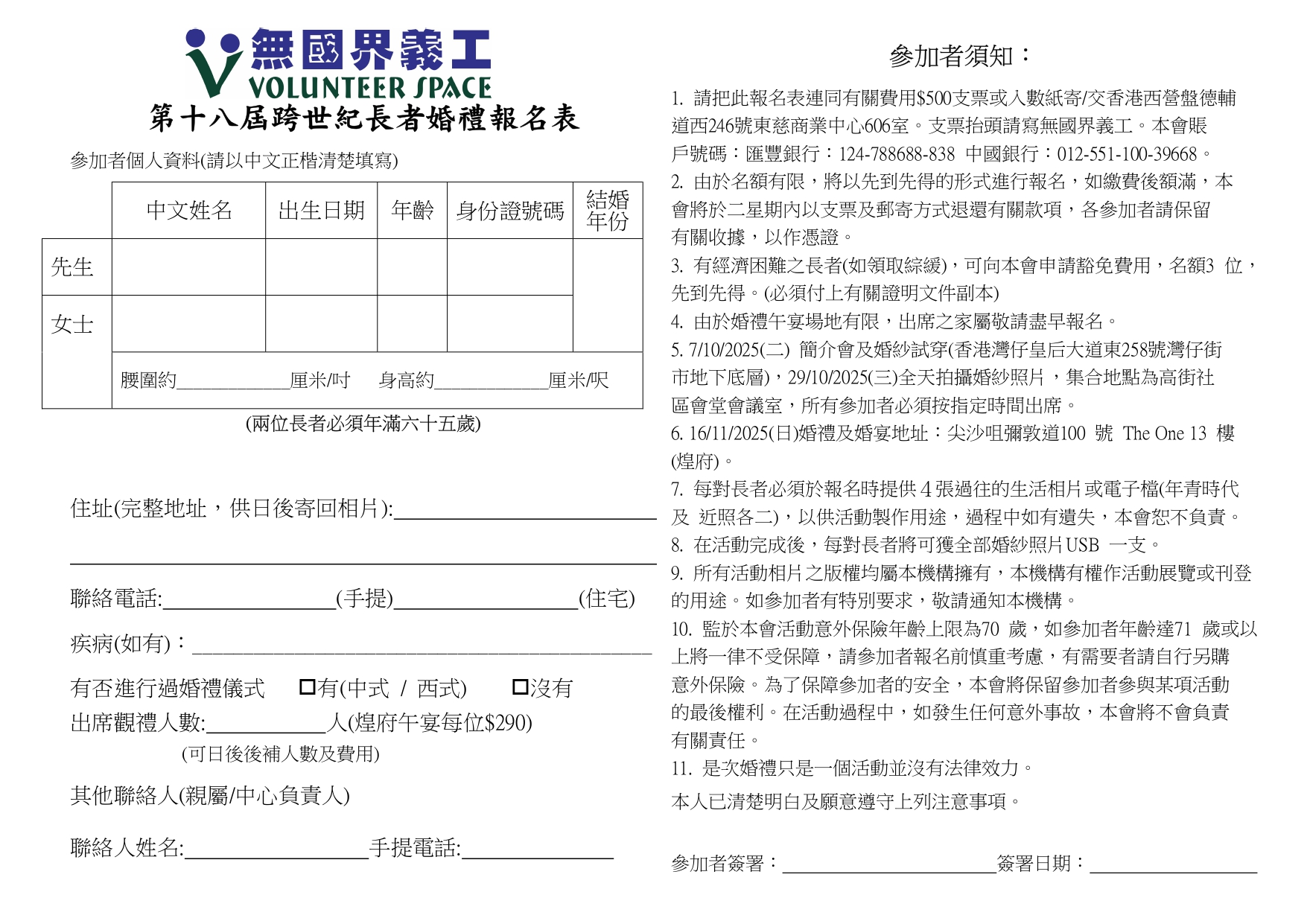 2. 由於名額有限,將一律以年齡較高者優先參與為原則進行,額滿即止。 3. 每對長者必須於報名時提供4張過往的生活相片或電子圖檔(年青時代及近照各二張) 可連同報名表一併寄至本會或電郵至program@volunteer.org.hk,以供活動製作用途,過程中如有遺失,本會恕不負責。 4. 參加者必須按本會義工指定之時間出席7/10/2025之試穿婚紗及採訪日、29/10/2025之拍攝婚照日。 5. 歡迎參加者家屬出席婚禮午宴及觀禮,座位有限敬請盡早報名及繳付午宴費用每人HK$290.00(三歲以下不佔座席免費),為確保每對長者家屬都可以出席觀禮,本會有權限制出席之家屬人數) 6. 午宴每圍十二人,座位安排由本會工作人員編訂(為確保每對長者家屬都可以出席觀禮,本會有權限制出席之家屬人數,非預先登記之家屬將不獲許進入場地。) 7 如有素食或特別需要之長者,請提早通知本會,本會只能盡量安排,但未必可以完全配合到要求。 8. 鑑於本會活動意外保險年齡上限為70歲,如參加者年齡達71歲或以上將一律不受保障,請參加者報名前慎重考慮,有需要者請自行另購意外保險。 9. 在活動過程中,如發生任何非人為的事件,本會將不會負責有關責任。 10. 婚紗由本會借用予各參加者。所有借出之婚紗或禮服必須完整歸還,如有遺失、損壞,需作賠償。 11. 在活動完結後,每對長者將可獲全部婚紗照片(將存放在USB內)(相片數量按參加者拍攝情況而定) 12. 所有活動相片之版權均屬本機構擁有,本機構有權作活動展覽或刊登的用途,參加者不可異議。如參加者有特別要求,敬請報名前通知本機構。 13. 為了保障參加者的安全,本會將保留參加者參與是次活動或某部份活動的最後權利。 14. 是次婚禮只是一個活動並沒有法律效力。 |